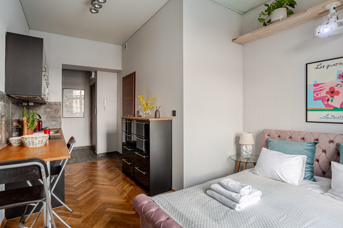El apartamento estudio está situado en Cracovia en un edificio histórico renovado en la calle Krowoderska. El apartamento está ubicado a 8 minutos de la plaza principal, cerca de tiendas, restaurantes y transporte. El estudio ha sido completamente renovado con una nueva cocina y baño, muebles nuevos. Tiene un gran sofá cama, cama doble, armario, techos altos, baño luminoso con todos los accesorios. El departamento está en el cuarto piso con vista al patio.