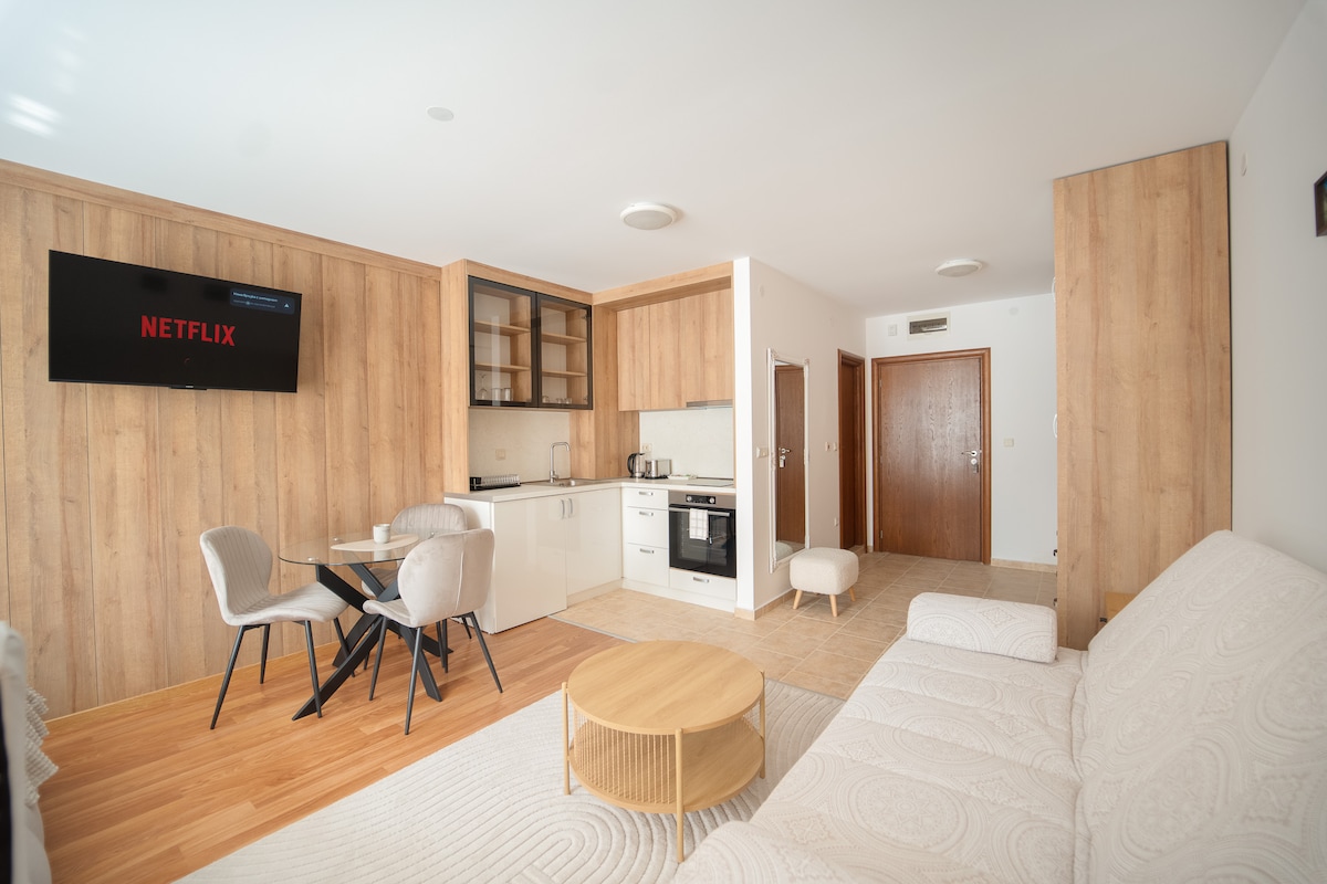 Нов, светъл и стилно обзаведен апартамент в новопостроена сграда. Апартаментът се намира на 20м. от централната градска улица. Апартаментът разполага с кухня, 1 спалня, баня с тоалетна, и тераса. Диванът в хола се разтяга и е подходящ за деца до 8г. Предлага се бебешка кошара при заявка. Безплатен и бърз интернет и кабелна телевизия. Подсигурено парко място. Сградата има асансьор.