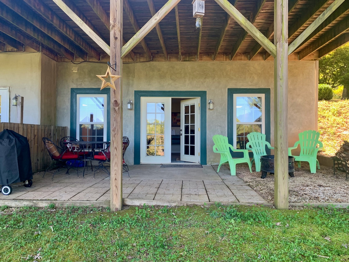 Disfruta de la tranquilidad de las estribaciones de Carolina en esta unidad de la planta baja. El apartamento privado cuenta con paredes de piedra natural, vigas de madera a la vista, toques de color, muebles de buen gusto, decoración de alta gama y una salida al primer piso. La vista desde las grandes ventanas son árboles y bosques, lo que contribuye a una sensación de estar completamente rodeado de naturaleza. Estamos ubicados en las estribaciones de las montañas Blue Ridge: los picos están cerca, pero no se pueden ver desde el apartamento. Vivimos arriba y somos muy tranquilos y discretos; es posible que oigas algunos pasos ocasionales o agua corriente. No se permiten eventos ni sesiones de fotos. Canebrake Road es un camino rural de grava con curvas. Nuestra casa está en la parte superior del carril a la izquierda: la entrada a la entrada está ocupada por una ove de cemento que luce el número de la casa alrededor de su cuello, y está oficialmente a 0,56 millas del comienzo de Canebrake Road. Gira a la izquierda en nuestra entrada. Por la noche, dirígete a la farola que hay encima de nuestro garaje. La cocina pequeña tiene todo lo que necesitas para comidas rápidas y fáciles. Nevera/congelador, microondas, horno tostador, placa eléctrica (si se solicita), cafetera, fregadero completo y vajilla completa. La sala de estar tiene un televisor inteligente, libros, cartas, juegos y revistas para mantenerte ocupado por la noche. El estudio es muy espacioso y, si tienes un hijo, el sofá será suficiente o podemos proporcionarte una cuna pequeña. Los bosques circundantes son tranquilos y envolventes, propicios para un sueño largo y reparador. Los cantos de los pájaros y los grillos son casi todo lo que puedes escuchar... Los huéspedes pueden estacionar en la zona superior de la entrada, donde es más fácil maniobrar, o directamente delante del apartamento. El apartamento es muy privado y está aislado de las entradas principales de la casa. Estamos en la casa contigua y podemos responder a cualquier pregunta que tengas. Te dejamos a tu aire, o socializaremos si es apropiado. Vosotros sois los huéspedes y el tiempo aquí os pertenece... El apartamento se encuentra en la cima de una pequeña colina, al que se llega por un carril de grava curvado y está a menos de 5 minutos del centro de Tryon y Columbus, hogar de una serie de tiendas, restaurantes, galerías de arte, cine y más. El Centro Ecuestre Internacional de Tryon está a solo 15 minutos y Harmon Field, un complejo atlético, se encuentra al comienzo de nuestra carretera. En verano, las casas de nuestros vecinos son invisibles. La ubicación es privada y serena. Es obligatorio disponer de un coche. Tenemos un bonito circuito para caminar, justo a la puerta principal, que te lleva a través del bosque. Harmon Field está a 2 minutos a pie por el carril, con múltiples instalaciones deportivas y el río Pacolet para pasear.