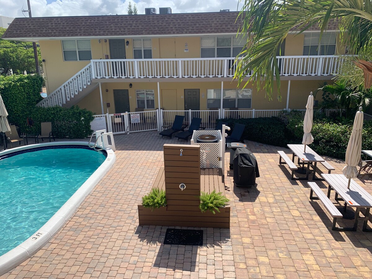 PROPIEDAD SOLO PARA ADULTOS MAYORES DE 21 AÑOS. Bienvenido a PoolHouse FTL. Entra por las puertas y deleita tus ojos con este elegante, moderno y lujoso oasis de estilo resort. Cada uno de los apartamentos de estilo bungalow de un dormitorio se abre directamente a la enorme piscina de travertino y solárium, y a la piscina ÉPICA que está climatizada todo el año. Privado, cerrado, rodeado de exuberantes jardines tropicales. Puedes cancelar todos tus planes y estar junto a la piscina durante toda tu estancia. Ubicado a minutos de las playas, el centro de la ciudad y las famosas mansiones de Wilton.