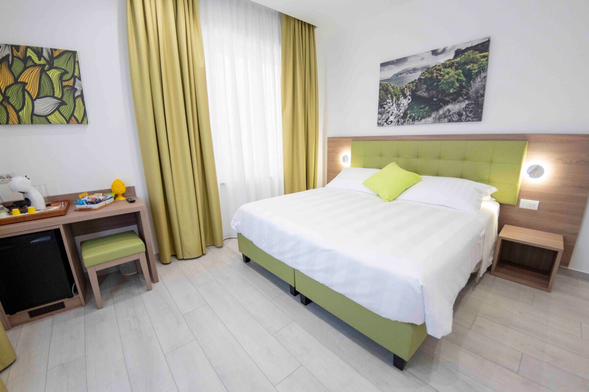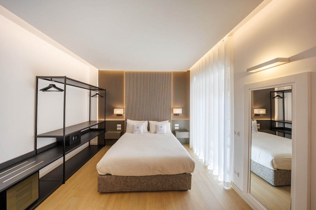 Habitación espaciosa con muebles luminosos y funcionales. La habitación dispone de todos los accesorios modernos, entre ellos: • Kit de bienvenida • Cambio de sábanas • Nevera • Aire acondicionado • Calefacción • TV • Caja fuerte • Wifi • Baño con ducha y cromoterapia • Secador de pelo • Hervidor eléctrico con infusiones siempre a tu disposición • Cafetera con cápsulas
