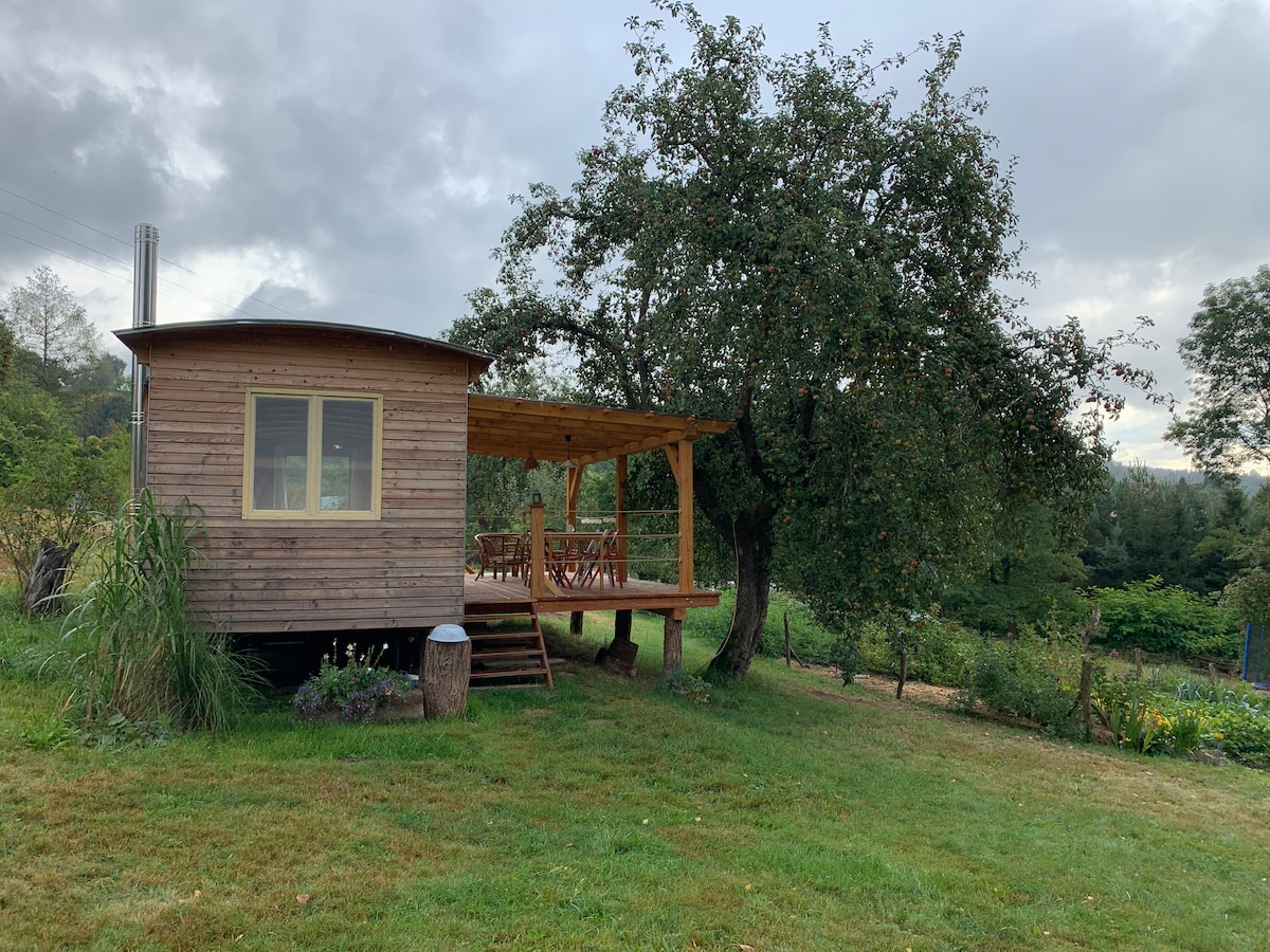 La caravana Pod jabloní está diseñada para atraer su atención a la percepción de sí mismo y de la naturaleza, disfrutando de la paz, la tranquilidad y la belleza. Sencilla pero cómoda. Recientemente creada para el glamping, toda de madera con aislamiento de lino, lista para permitirle saborear la tranquilidad del jardín, oler y degustar algunos de sus regalos. Se encuentra en las afueras del pueblo, en una parcela de media hectárea.