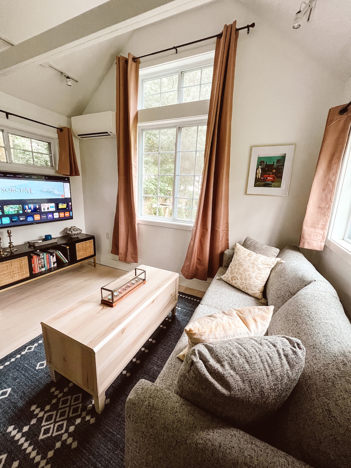 • Perfect for small families or couples, our signature A-Frame cabin features a modern interior gas burning fireplace, soaring ceilings, huge windows, stylish interiors, and all the comforts of home. • This cozy 1,100 square foot space comfortably accommodates up to four guests in two bedrooms (one with a King-size bed and the other with a Queen-size bed) and a shared bathroom. • 7 minute drive to downtown Freeport. • Proud to be ranked in the top 1% and voted Guest Favorite!