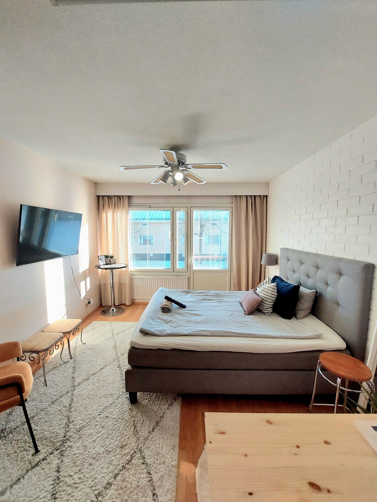 Este acogedor departamento está en el corazón del centro de Pori. Todo está cerca. Justo enfrente del departamento hay un estacionamiento gratuito. El wifi gratuito está incluido. Todo el apartamento está en tu uso, incluido tu propio balcón. El departamento tiene 1 dormitorio con una cama doble (140 cm). En el salón hay un sofá normal (no un sofá cama/ ei vuodesohva). Las sábanas y toallas están incluidas en el precio.