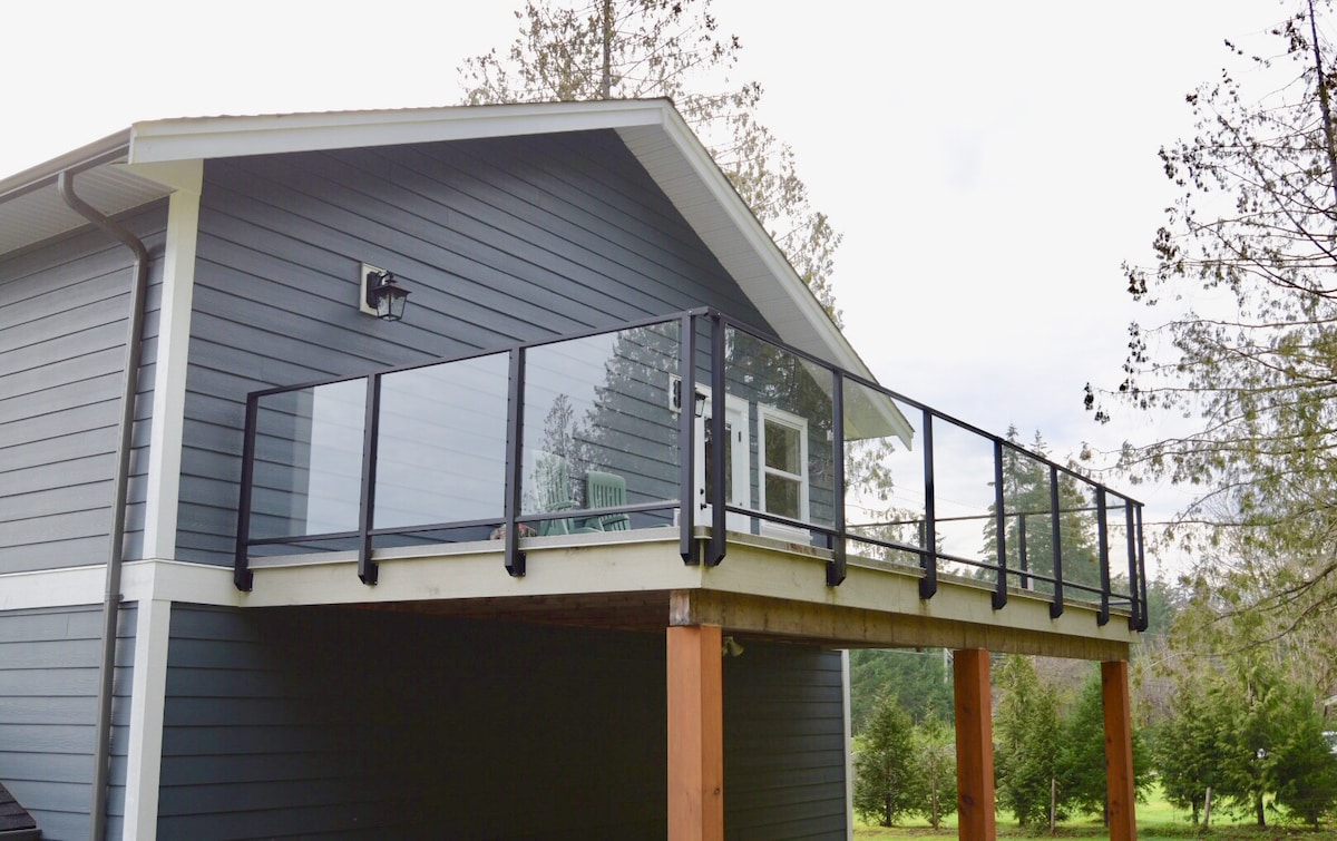 Esta inmaculada casa de huéspedes con su terraza privada y su generosa sala de estar invitan a la comodidad. Cuenta con un encanto rural único con muchos muebles artesanales junto con una tabla larga hecha de cedro. Capacidad para 6 personas cómodamente con 2 dormitorios, (1 king y 1 queen), junto con un sofá cama queen. Un baño con ducha, lavadero y una cocina totalmente equipada, tienes todo lo que necesitas para sentirte como en casa. Situada en el campo con senderos cerca y a solo 5 minutos de las tiendas.