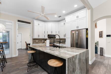La sala de estar tiene un televisor inteligente de 65 pulgadas, montado en la pared con una chimenea LCD debajo con sonido envolvente. Todos los televisores tienen Netflix. La sala de bar tiene una nevera pequeña, mesa de billar y tablero de dardos. El exterior tiene un lanai privado con piscina climatizada y un fogón de propano. Disfruta del sonido de sonos con un televisor inteligente de 55 pulgadas en el dormitorio principal. El segundo dormitorio también tiene un televisor. La sala de bar también tiene sonido, así como el lanai. A 30 minutos de varias playas. El garaje no estará disponible. Casa ubicada en un tranquilo Cul de Sac.
