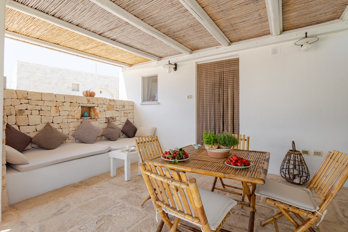 This unique space, carved inside traditional trulli, has its own charm and lets you experience the true spirit of the Itria Valley. You enter through an old strawberry‑grape pergola. The kitchen and bathroom are set in the alcoves, while the dining and sleeping areas are located in a saracen trullo and a tall‑cone trullo. The private patio and nearby infinity‑edge pool offer views of the valley and the skyline of Ceglie Messapica.