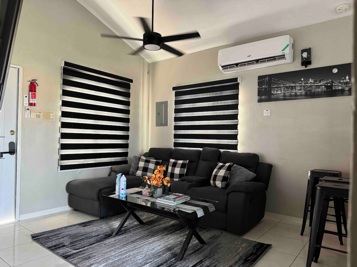 Moderna casa de 2 dormitorios y 1 baño, hecha y personalizada para tu propia paz y relajación en una comunidad cerrada. Los dormitorios están equipados con televisión con acceso a Netflix, wifi, aire acondicionado y ventilador de techo en cada habitación. La casa también viene con su propia lavadora y parrilla. Cocina con luz propia y nevera con 🧊 máquina de hielo. Lámparas de noche con cargadores de teléfono 🔌 y alarma ⏰ para despertarte.