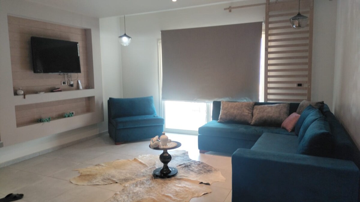 Moderno apartamento de 2 dormitorios dentro del Elite Tulip Hotel, Ain Sokhna. Totalmente equipado con cocina, wifi, aire acondicionado y vista trasera tranquila. Capacidad para 4 personas. Acceso gratuito a la playa privada de arena, piscinas y vestíbulo del hotel. Servicios de pago: restaurantes, lavandería y gimnasio. Lugar ideal para relajarse junto al mar con las comodidades de un hogar y las ventajas de un centro vacacional.