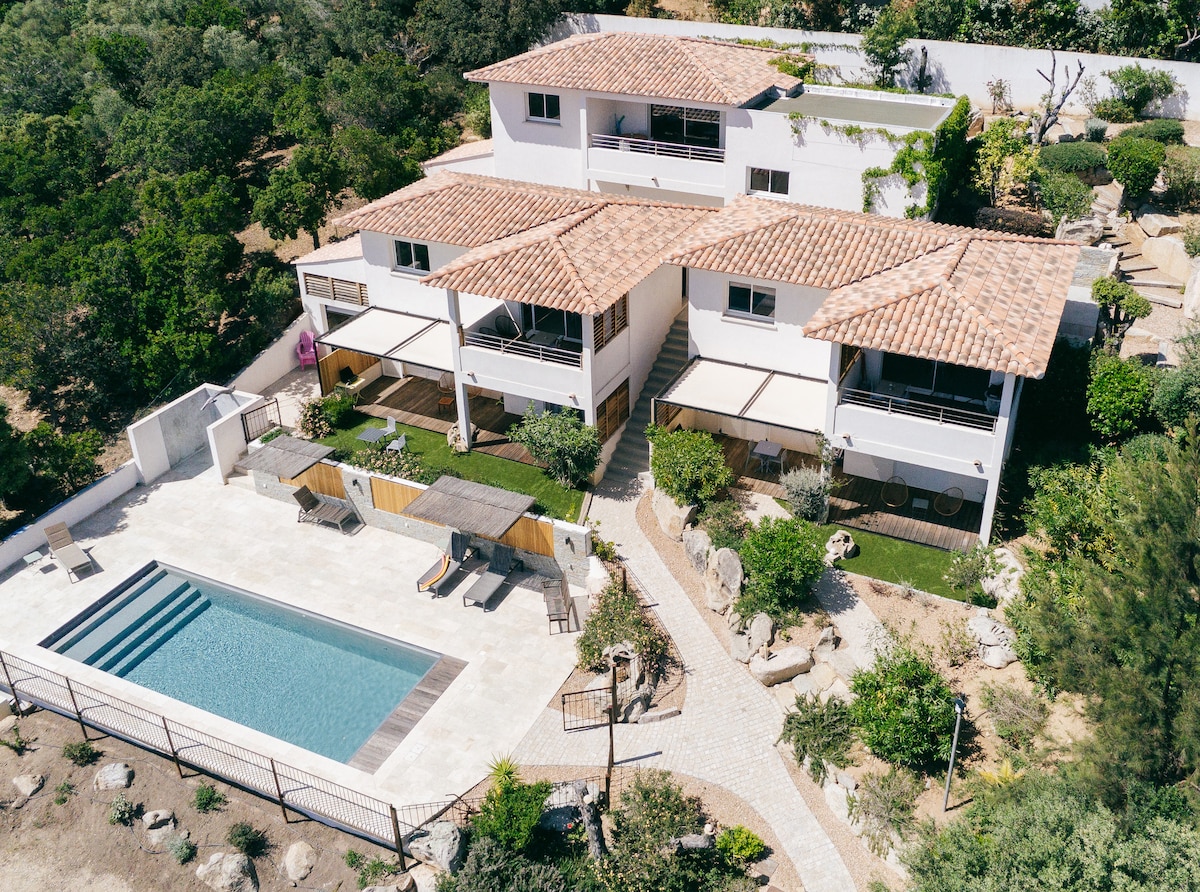 Ven a disfrutar del tiempo de una comida de verano en la terraza, en este entorno relajante donde la vista del bosque y la tranquilidad del lugar permiten relajarse, Después de disfrutar de un cóctel en la piscina climatizada, o leer un libro en la bañera de la Masterpiece, podrá llegar fácilmente a la playa más cercana, que está a 10 minutos, o disfrutar del encanto de un río corso, a 5 minutos de la villa. PD: los gastos de limpieza se reembolsan si los realiza usted mismo