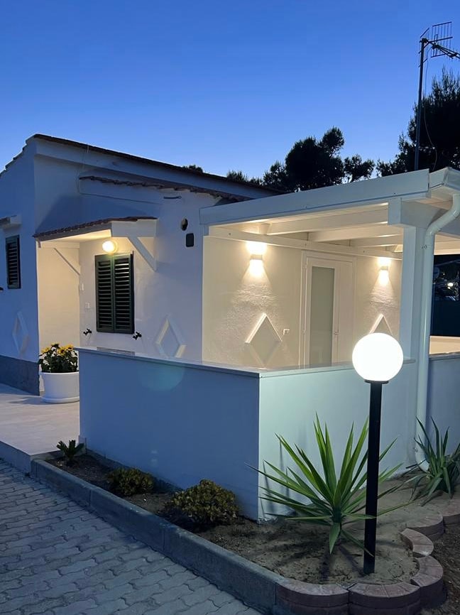 La casa está en la planta superior y tiene una terraza privada rodeada de palmeras gigantes donde es posible desayunar o almorzar en contacto con la naturaleza. La cocina y la sala de estar se encuentran en un espacio abierto con un estilo típico de Apulia. Hay un dormitorio con una cama doble y un dormitorio con 2 camas individuales. Para familias con más de 2 niños, se puede usar el sofá cama en la sala de estar. La casa está a 5 minutos cerca de la playa y el centro