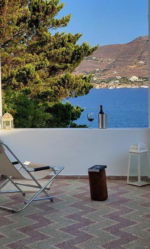 Fully equipped one-bedroom apartment with frontal sea view. One double bed in the bedroom, fully equipped kitchen (oven, fridge-freezer, dishwasher, 4-pits), bathroom with bathtub , washing machine, private terrace with chairs and table. Access to a shared patio with direct access to the sea (rocks) where the guests can take a morning swim. Frontal sea view from living and bedroom. A few steps from the center of Ermoupolis.