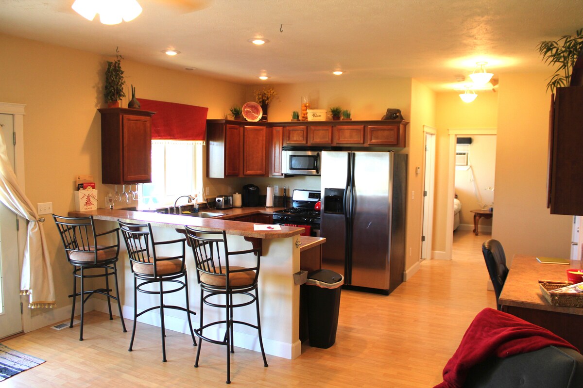 Gran suite privada cerca del centro de Coeur d'Alene. Luminosa, espaciosa, tranquila y muy privada, y a solo un corto trayecto panorámico en coche del centro de la ciudad. Nuestro pequeño rancho moderno se encuentra en 8 acres cercanos en una carretera pintoresca bien mantenida donde es común ver alces, ciervos, pavos e incluso alces. Es un lugar ideal para una escapada serena o un viaje de negocios, pero no apto para fiestas. Muy fácil acceso al lago Coeur d'Alene y al centro de la ciudad.