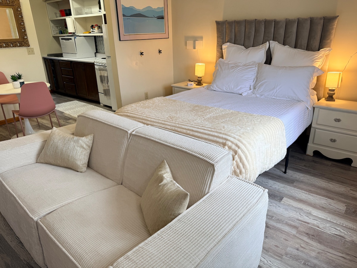 Tu campamento base durante todo el año para actividades, eventos o simplemente para relajarte en los Adirondacks. Este elegante apartamento de un dormitorio, completamente nuevo, es perfecto para viajes en grupo o si ustedes dos quieren escaparse solos. Además, cuenta con una cama tamaño queen con colchón Dreamcloud en el dormitorio privado, que también tiene TV, y con un sofá cama y un sillón para acomodar a más personas de su grupo si les acompañan otras. El departamento está sobre el garaje, que está separado de la casa.