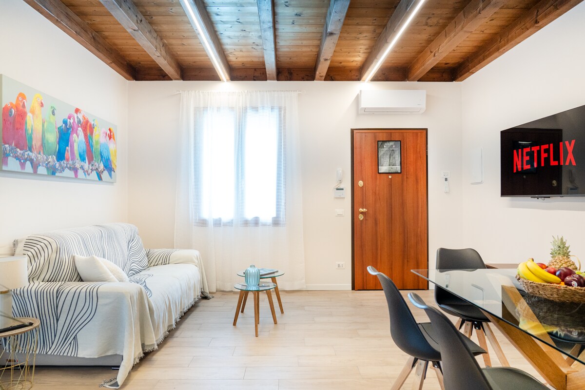 Amplio apartamento en el primer piso de un edificio señorial, a 5 minutos a pie de la Arena, frente al Adigio, terraza con vistas, dos habitaciones dobles, una de ellas con una tercera cama, gran sala de estar con TV y sofá cama adicional, cocina espaciosa. Aire acondicionado en la sala de estar y en los dos dormitorios. Cerca de todos los servicios, supermercado, farmacia, restaurantes, enotecas. A dos pasos del centro, pero en una zona tranquila y silenciosa.