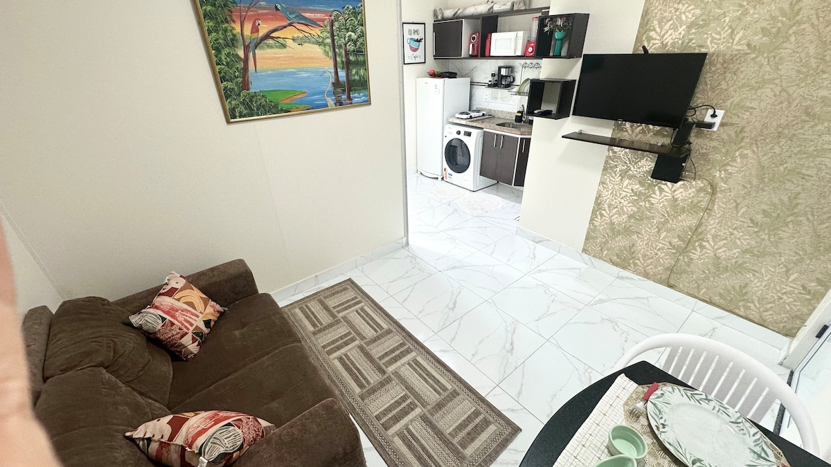 Apartamento en condominio seguro. El lugar está bien ubicado, cerca del Palacio Rio Negro en el centro de Manaos. El lugar es acogedor, limpio y seguro, ya que cuenta con una caseta de vigilancia. El espacio está en el tercer piso (subir escaleras) tiene capacidad para dos personas para una cama queen, sofá cama y espacio para una hamaca. El apartamento es totalmente “suyo” NO es compartido.