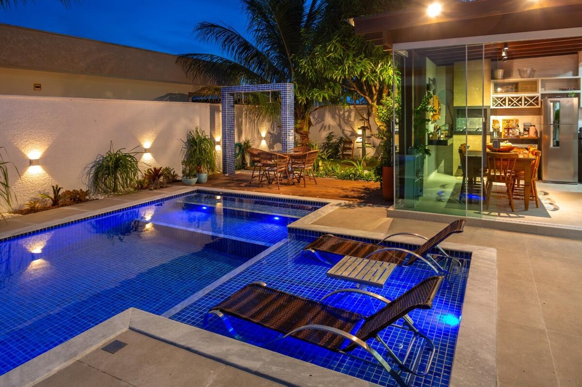 CasaCharmeConforto Arraial tiene 2 suites, una cocina completa y una PISCINA PRIVADA. Se encuentra en una zona noble con fácil acceso a la Rua Mucugê y a las playas. MÁXIMO PERMITIDO: 8 personas. A los huéspedes les gusta mucho la ubicación. A 2 minutos en auto del centro de la ciudad. A 3 minutos en auto del Eco Park. Ideal para aquellos que quieren disfrutar y al mismo tiempo relajarse en un ambiente acogedor y seguro. Tenemos ropa de cama/baño, aire acondicionado, lavadora, wifi y parrilla. RECOMIENDO UN AUTO. - Entrada/salida flexible.