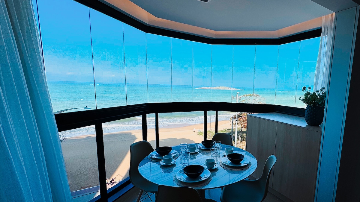 Increíble vista al mar de Praia da Costa, en la mejor ubicación de Vila Velha. Un lugar donde el paisaje forma parte de la experiencia. 🎆 Y en la víspera de Año Nuevo, los fuegos artificiales se pueden disfrutar desde la cabaña, una de las más hermosas que hemos visto desde el balcón del apartamento.