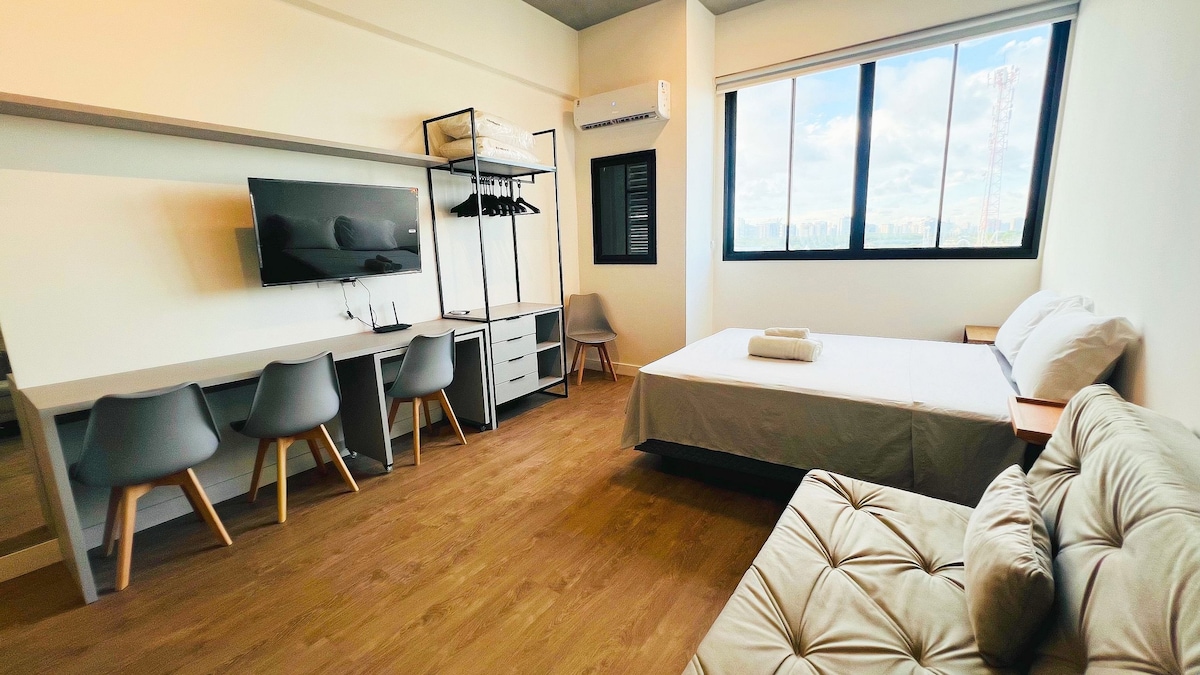 Moderno y bien equipado Studio Master Loft, ubicado frente al encuentro del río Sergipe con el mar. Ambiente integrado y con aire acondicionado con cama cómoda, sofá, TV e iluminación acogedora. Cocina completa con encimera, freidora de aire, microondas, nevera, licuadora, cafetera y filtro de agua. El mostrador también funciona como una oficina en casa. Vista abierta e inspiradora. Ideal para parejas, viajes de negocios o de placer en Aracaju.