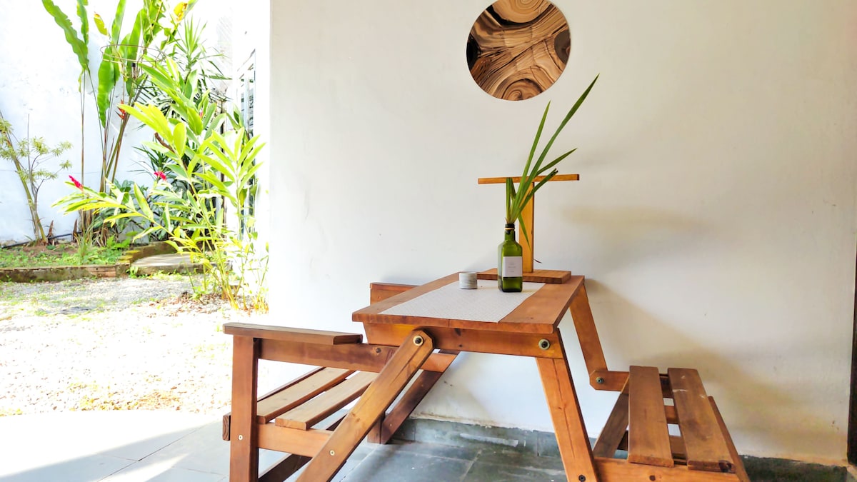 La habitación está equipada con aire acondicionado y ventilador de techo para garantizar comodidad. La cama tiene un colchón de resortes y almohadas, complementados con ropa de cama y baño. La ducha turbo ofrece un baño vigorizante, mientras que el Wi-Fi de fibra te mantiene conectado. Para el entretenimiento, hay un televisor inteligente de 32 pulgadas. El comedor incluye una mesa con una silla, y la cocina está equipada con una nevera de 120 L, microondas, platos, vasos y cubiertos, lo que proporciona practicidad y funcionalidad.