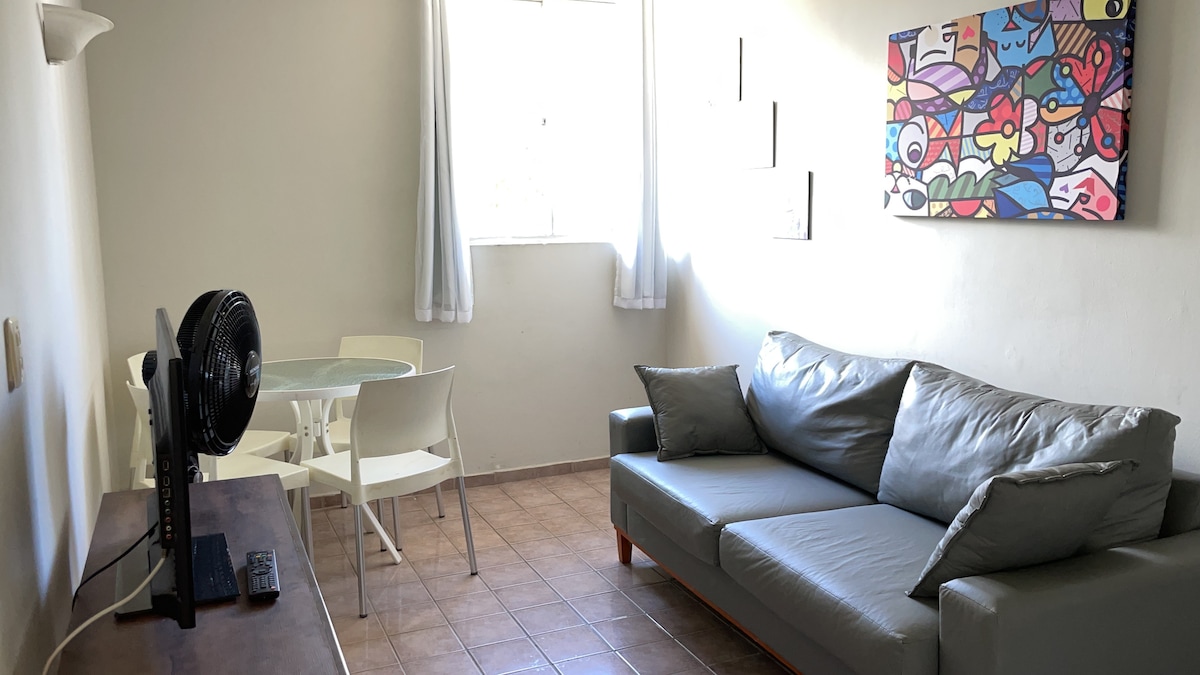 Flat pequeno e aconchegante. SALA - Sofá, TV, mesa de jantar, 4 cadeiras, rede, ventilador COZINHA - Geladeira, fogão, microondas, liquidificador, panelas, pratos, copos, cafeteira QUARTO- Cama de casal, travesseiros, lençol, fronhas, edredom, puf, ar-condicionado, guarda-roupa, ferro de passar, tábua de passar, TV com Netflix BANHEIRO- Chuveiro elétrico, toalhas, chapinha, secador. - Wifi (NET) - Estacionamento - Piscina - Lavanderia (taxa para lavar e secar) -Porteiro 24h