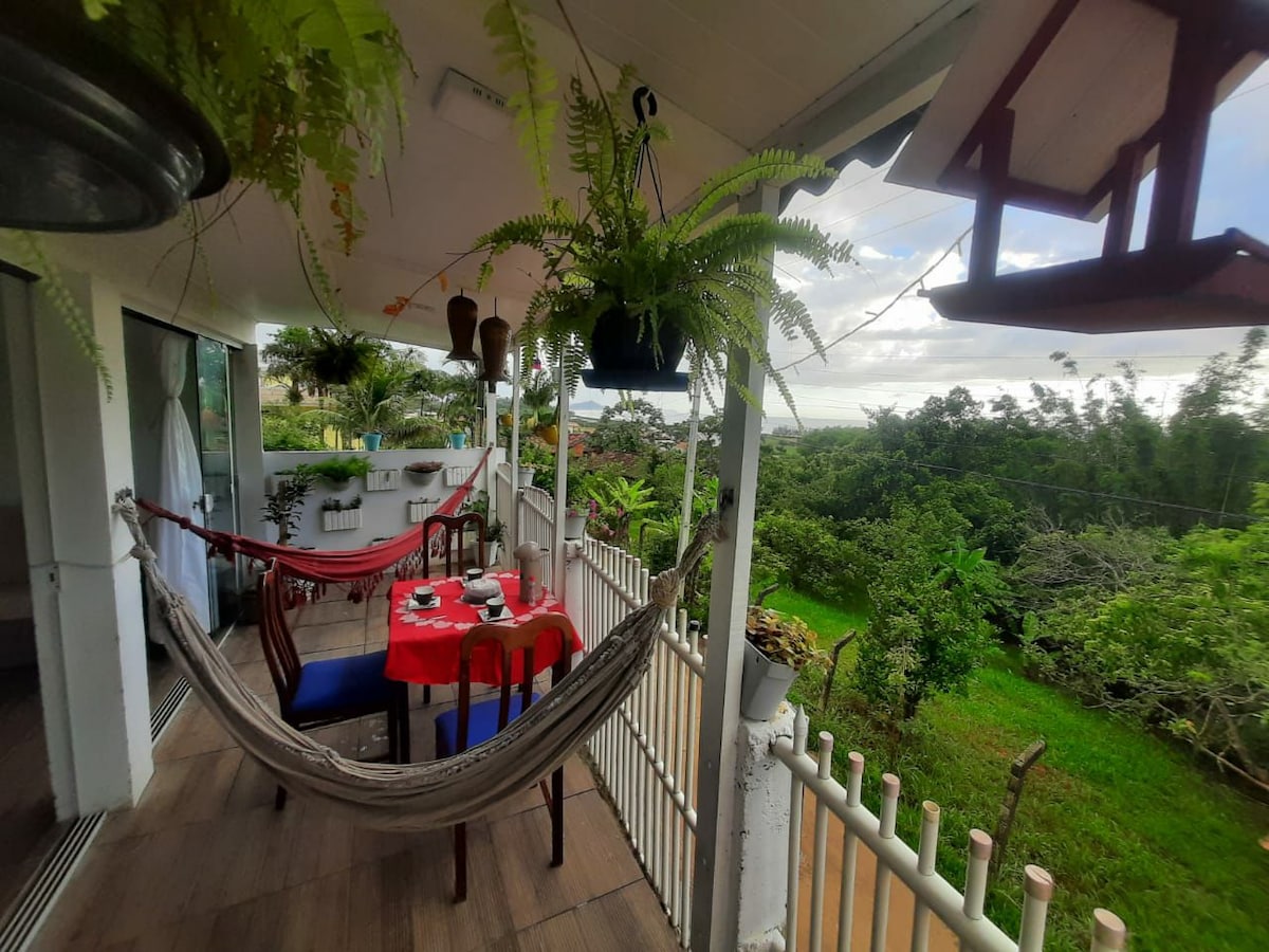 ¡Para deleitarte! ¡Encantadora casa en uno de los increíbles lugares de Garopaba, rodeada de montañas y aguas termales con vistas al bosque solo para ti! Municipio de todo, pero sin ruido. Mira el amanecer en el mar. A 1 minuto en auto de las fascinantes dunas, tablas de arena, carril bici y autopista que facilitan el acceso al centro, mercados, tiendas, playas, miradores. ¡Y a 4 minutos de la playa más cercana! Una casa entera, equipada. ¡Ideal para que las parejas se desconecten de la rutina y se sumerjan en días de paz y comodidad!