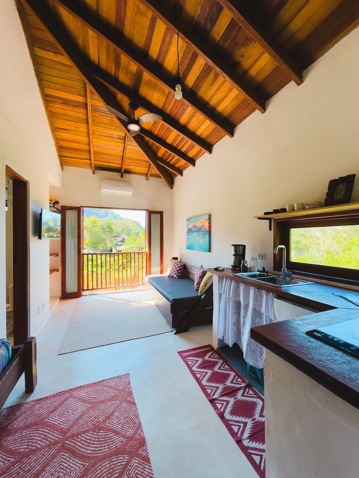 Desde el mar, con exuberante vegetación, este elegante alojamiento es perfecto para viajes en grupo. Tiene cuatro suites grandes, camas queen y camas individuales. En las dos cómodas habitaciones puedes disfrutar de un sillón para leer, escuchar música o relajarte tumbado viendo la televisión (smartv de 55 pulgadas). Pero si tu afición es cocinar, nuestra área gourmet te complacerá. Tenemos horno de leña, horno de pizza y barbacoa, además de una cocina completa con todo lo que necesitas.