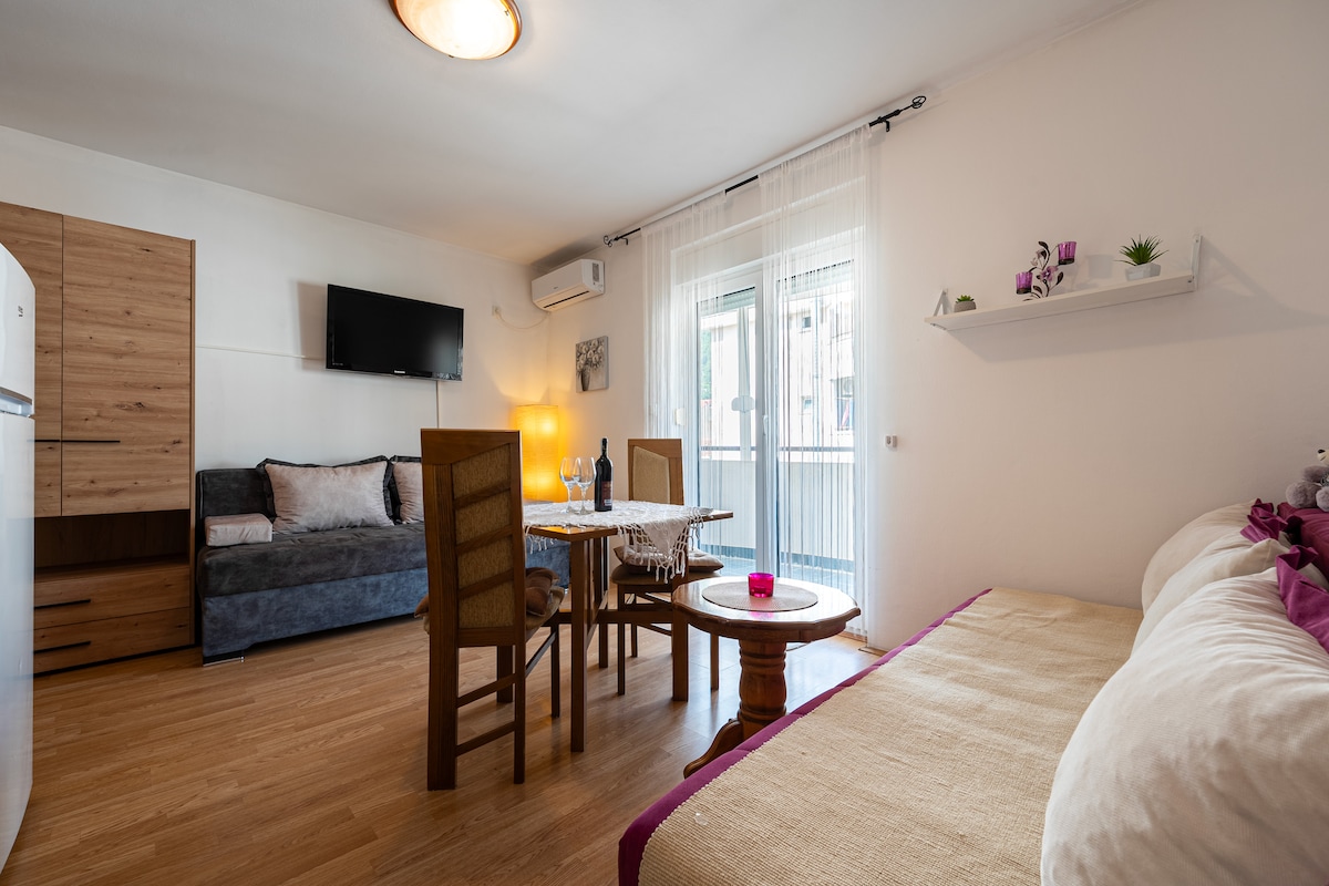Our apartment is perfect for couples or friends that want to enjoy Budva. Nice and clean apartment with one double bed and one pull-out sofa, with terrace in front. This cozy apartment has a great location - it's just 5 min from the beach and Old town. The shoping mall TQ Plaza, where guest can find huge supermarket, faramacy, bars, restaurants, cinema and many others shops, is just 2 min walking from the apartment. The apartment has free wi-fi and air-conditioned.
