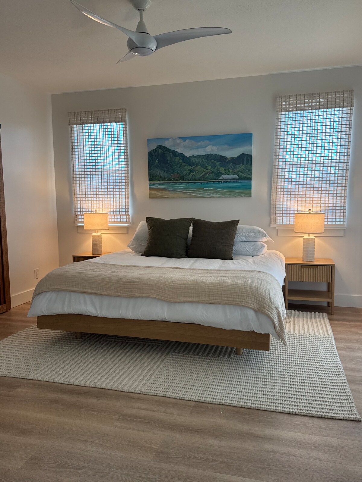 Welcome to Luana House. New construction , Boho Modern designed by a local architect, spacious house w/4 bedrooms, 4 bath, Air Conditioning on golf course. Covered Lanai includes seating, dining & BBQ. Make it a package deal & rent our convertible Jeep too. Amazing golf course views, walking distance to shopping, grocery & the beach. Ideal for remote workers, groups of friends, & families. Minutes away from Surfing at Hanalei Bay, Queens Bath, & the Makai Golf Course. Featured in Dwellescapes.
