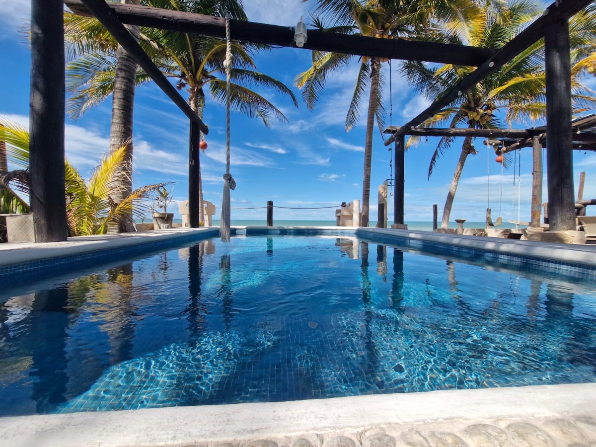 Villa Lujosa decorada vibra "Tulum" con acabados y muebles de lujo. Perfecta para unas vacaciones frente al mar Disfruta la terraza y una pequeña piscina para refrescarte saliendo del mar. Duerme la siesta en una hamaca con una espectacular vista desde la habitación principal y disfruta el sonido de la naturaleza. No cobramos energía eléctrica y tenemos generador de energía para emergencias, así que nunca te quedaras sin energía y sin aire acondicionado, que por cierto tenemos en todos lados :)