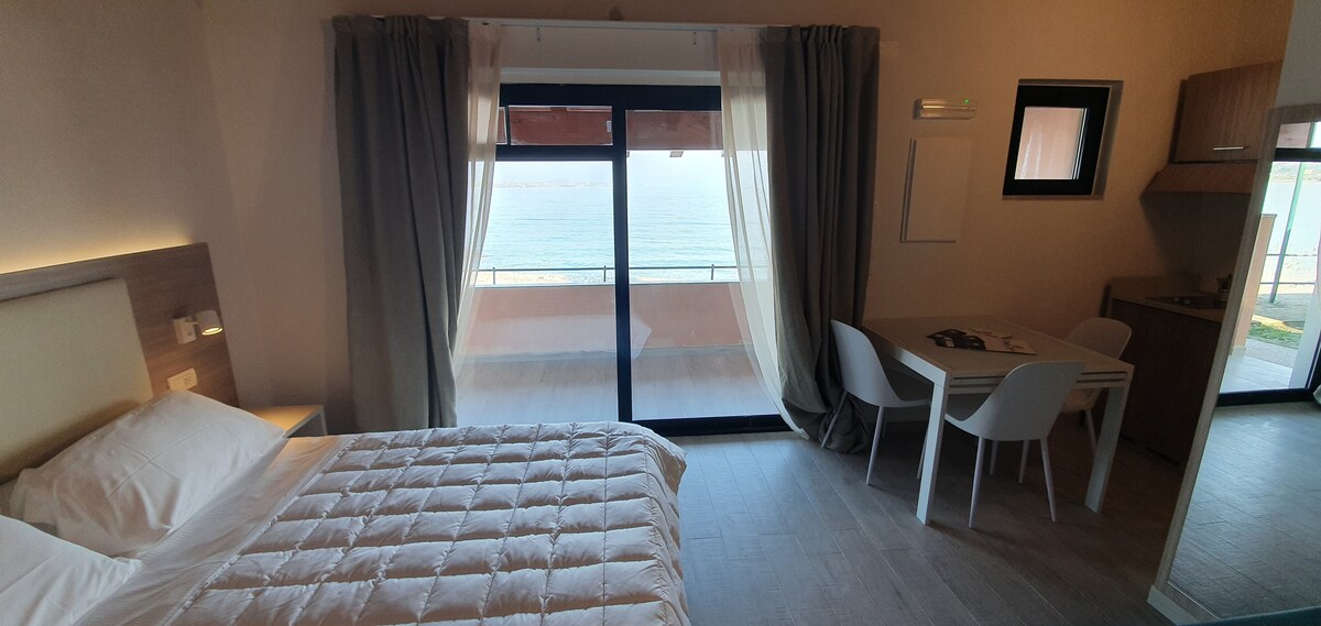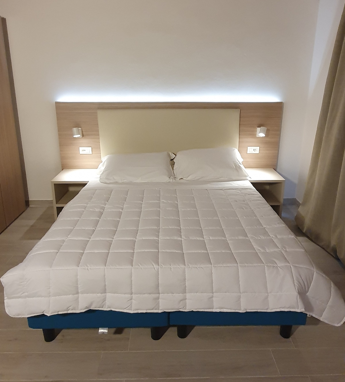 Suite con dormitorio doble + sofá cama adicional (2 plazas) en el salón, cocina americana equipada, TV color y amplia terraza con mesa y sillas. Aire acondicionado o calefacción independiente. Baño con ducha, bidé, kit confort, toallero eléctrico, secador de pelo. Estacionamiento cerrado y privado para cada suite. Servicio de recepción h24, restaurante disponible para desayuno, almuerzo y cena, bar, servicio de pool bar, dos piscinas (+ pequeña porción para niños).