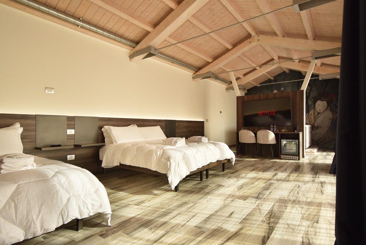 Déjate envolver por la sensación oriental de nuestra habitación de lujo. La bañera de hidromasaje tamaño king hará que tu estancia sea inolvidable y relajante. Los sofisticados muebles de estilo de diseño contemporáneo caracterizan el espacioso loft que acompañado de nuestras comodidades incluidas hará que tu experiencia sea única y agradable. En la habitación encontrarás una televisión inteligente con Netflix y Amazon Prime, cafetera Nespresso, baño con zapatilla, mininevera y wifi.
