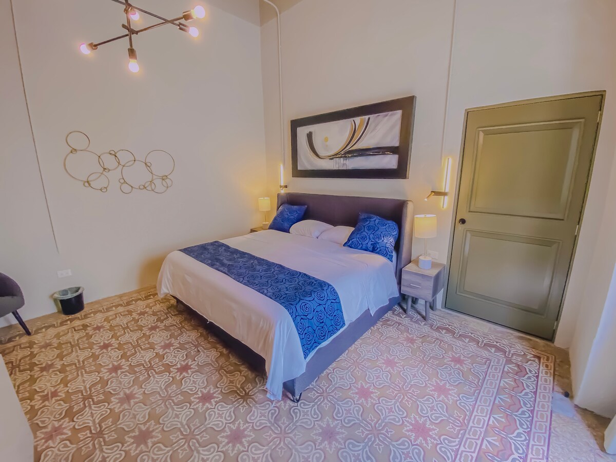 ESTACIONAMIENTO INCLUIDO Ubicado en el corazón de la ciudad habitación para 2 personas con cama Queen, baño completo, closet, caja fuerte y equipo de planchado. Habitación de estilo moderno y comodidad excepcional. Servicios Smart tv, Internet y una terraza con vistas impresionantes. Se encuentra en el ultimo piso del edifico, es necesario subir escaleras.