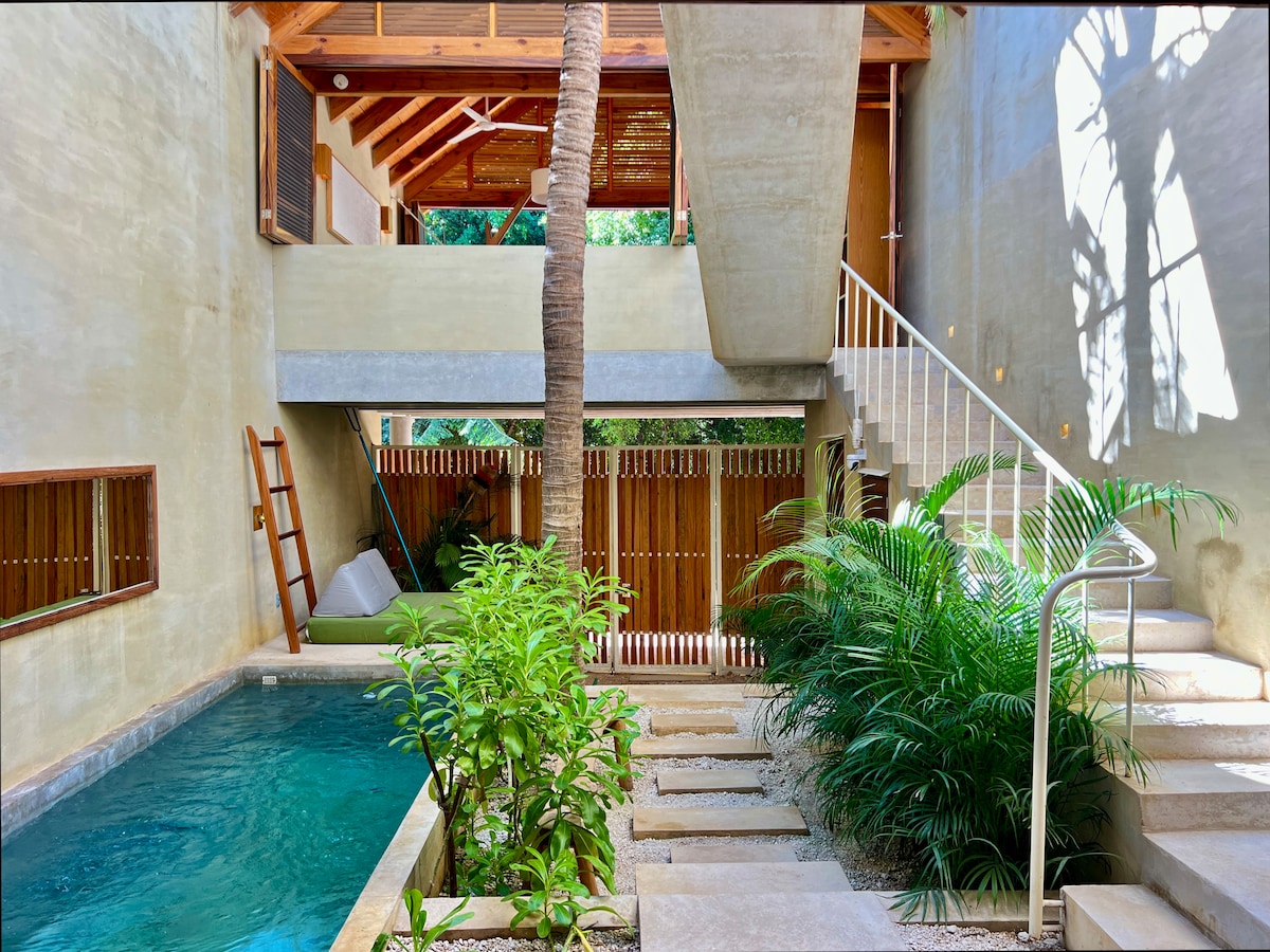 Hermosa y espaciosa suite con cama kingsize, TV giratoria de 50”, Aire acondicionado, cocina, baño y piscina privada. Siente la tranquilidad, relájate en el hidromasaje de tu piscina privada y disfruta de la comodidad de contar con todo lo necesario para una estancia placentera. Nos encontramos en Punta Zicatela, a 7 minutos caminando de la playa, principal punto de surf, restaurantes, bares y zona comercial. Cerca de todo, pero fuera del bullicio de la fiesta. Contamos con Internet Starlink