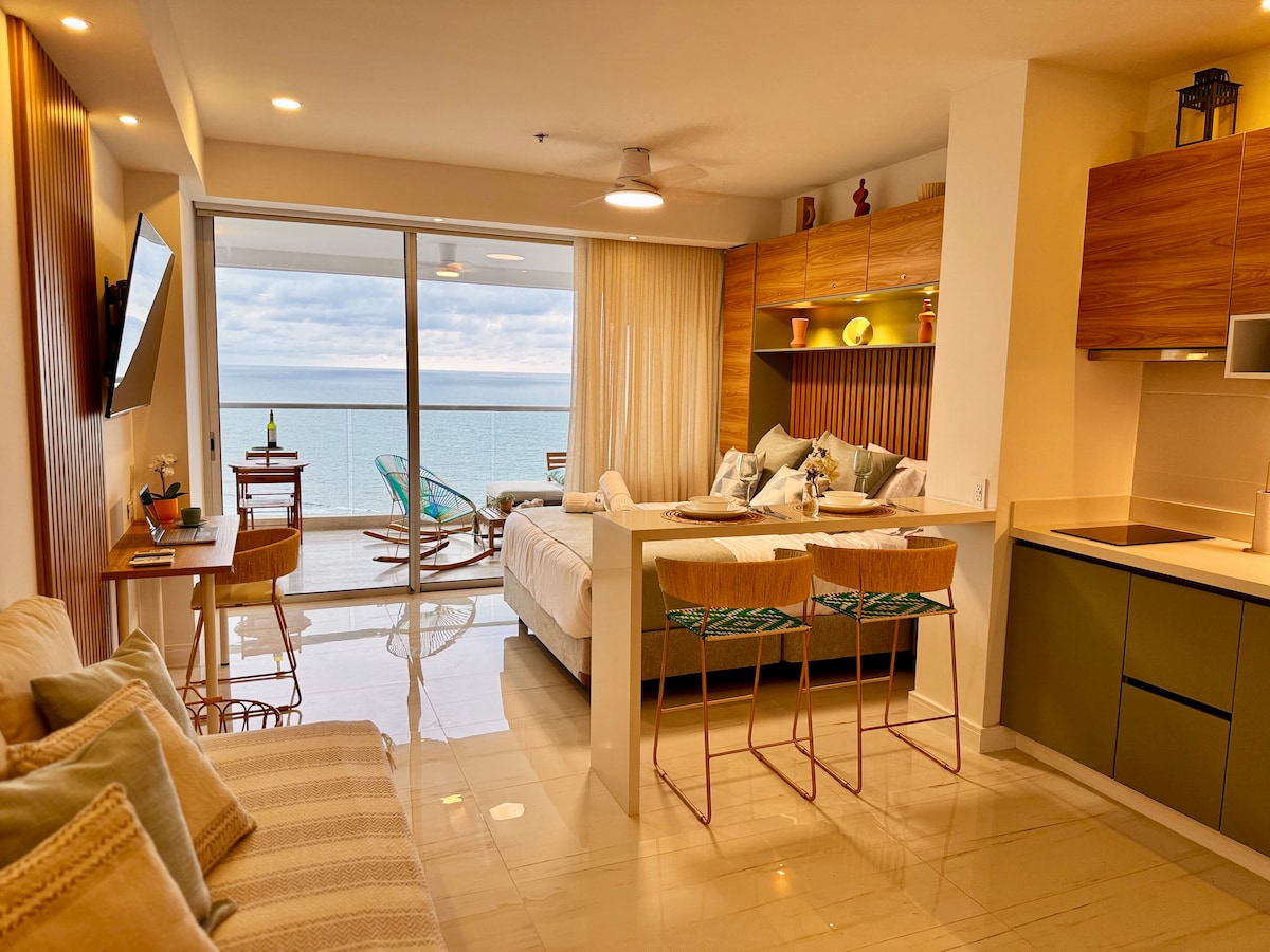 Relájate y disfruta de un hermoso atardecer, la brisa y una vista panorámica del Mar Caribe desde tu lujoso apartamento con terraza privada en Cartagena, en un piso 14 y primera línea de playa. Te hospedarás en Cartagena Beach Resort & Residences, un proyecto moderno, con amplias zonas húmedas y ubicado estratégicamente frente a la playa, Parque Lineal de Crespo, aeropuerto, comercios y a menos de 15 mins en Uber del Centro Histórico, Getsemaní y a las playas más bellas de la ciudad.