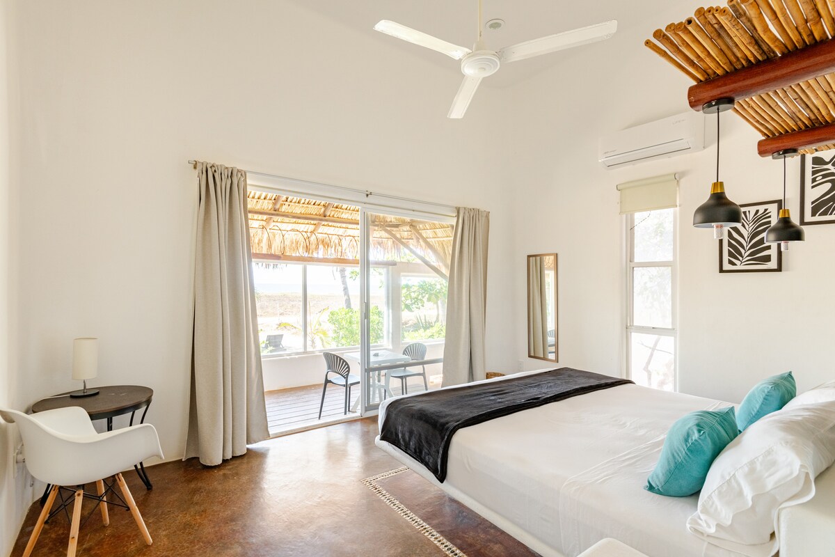 Disfruta de la vista de la bahía desde tu terraza privada o de un hermoso atardecer mientras cocinas, desde tu hamaca o incluso desde la comodidad de tu cama con Aire Acondicionado! Un lugar moderno y minimalista con el toque mexicano. El área de arriba está abierto, excepto por el cuarto. Cuenta con Starlink para asegurarte la conexión a internet, el baño tiene agua caliente, y la cocina está equipada con todo lo necesario. La casa es toda para ti.