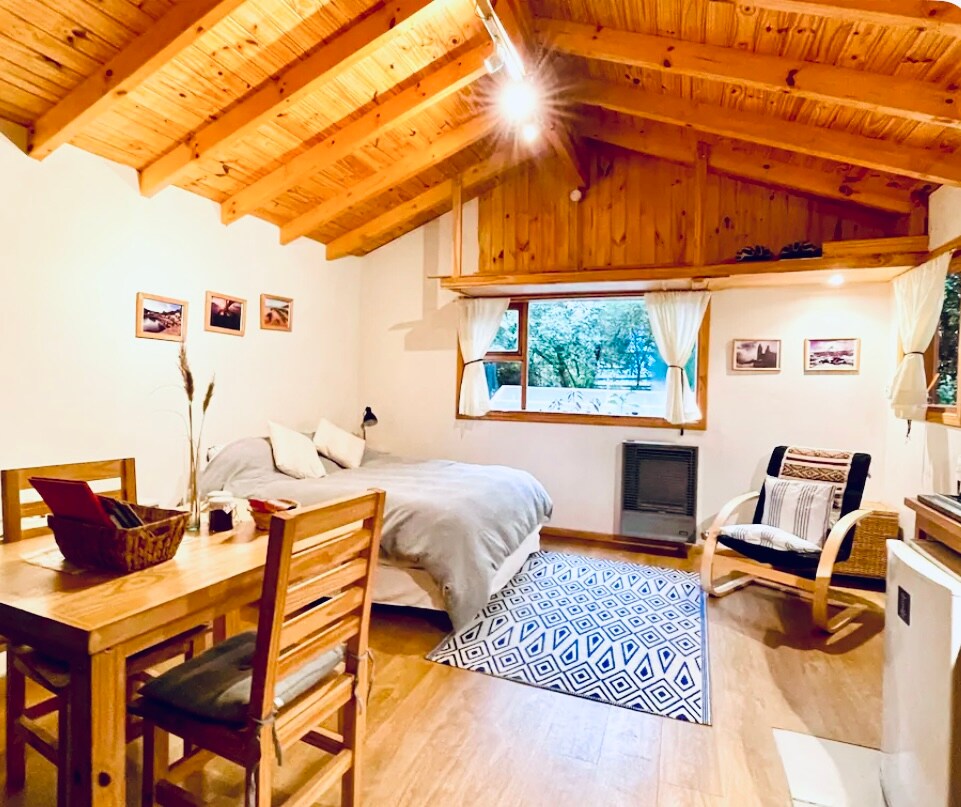 Cálida cabaña de estilo rústico a orillas del lago Nahuel Huapi con hidromasaje, hogar a leña, y deck. Monoambiente creado para el relax y el romanticismo con vista al amanecer y salida de la luna sobre el lago. Smart TV e internet por FIBRA OPTICA con wifi para trabajar. Una kitchinette con todo lo necesario, incluyendo cafetera dolce gusto. Caja de seguridad para resguardar tus notebooks al ir de paseo. Baño completo. Pool, ping-pong. Playa: Kayak y standup paddle. Desayuno continental.