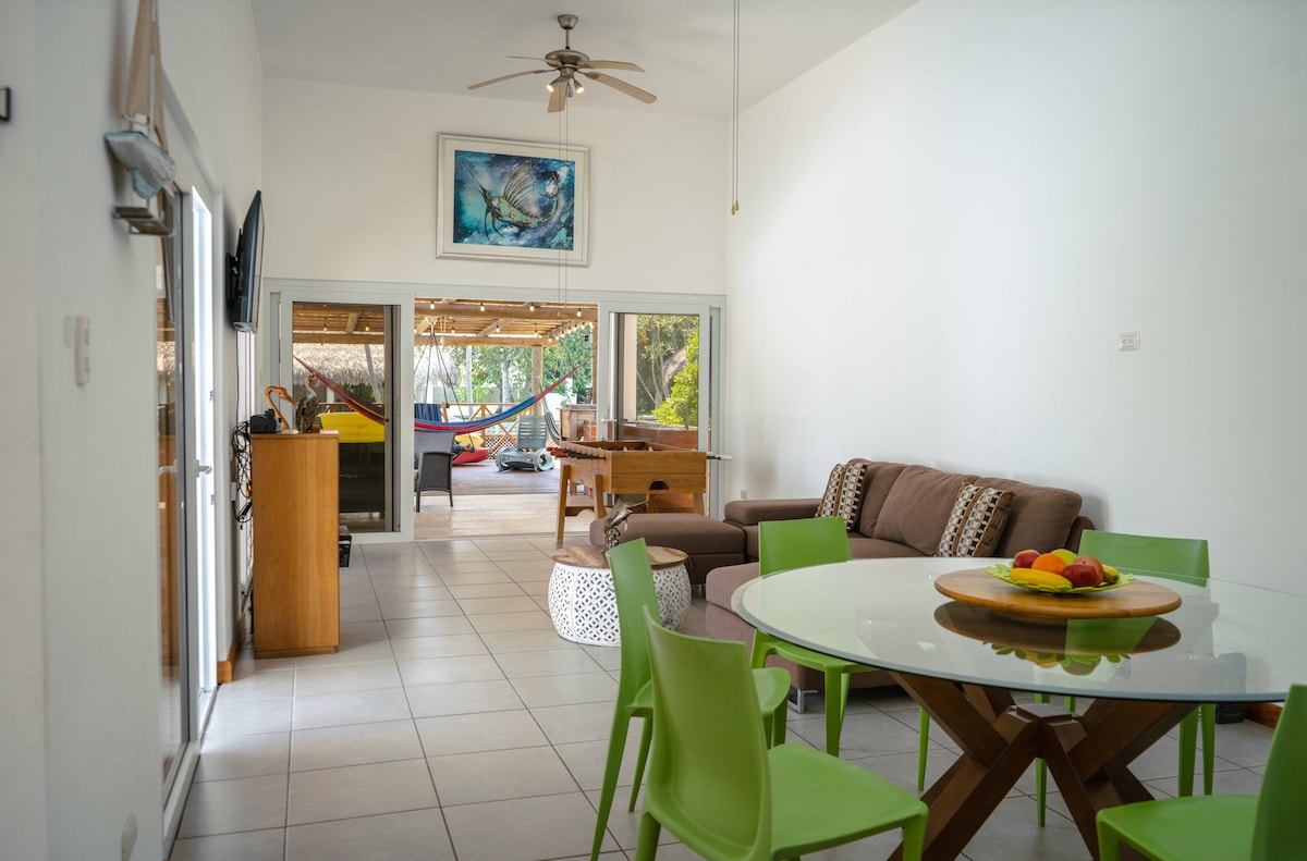 Con tu familia crea recuerdos inolvidables en esta casa en condominio seguro, con cocina moderna completamente equipada. Piscina privada grande con diferentes alturas para todas las edades, y múltiples sombrillas para tener sombra en la piscina. Acceso privado a la playa. Mesa de Ping-Pong, Juegos de niños y jardín de 500 metros para juegos al aire libre. Duerme cómodamente en 5 habitaciones con aire y TV, 16 camas en total. Parqueo para 4 carros dentro de la propiedad, más parqueos de visita.