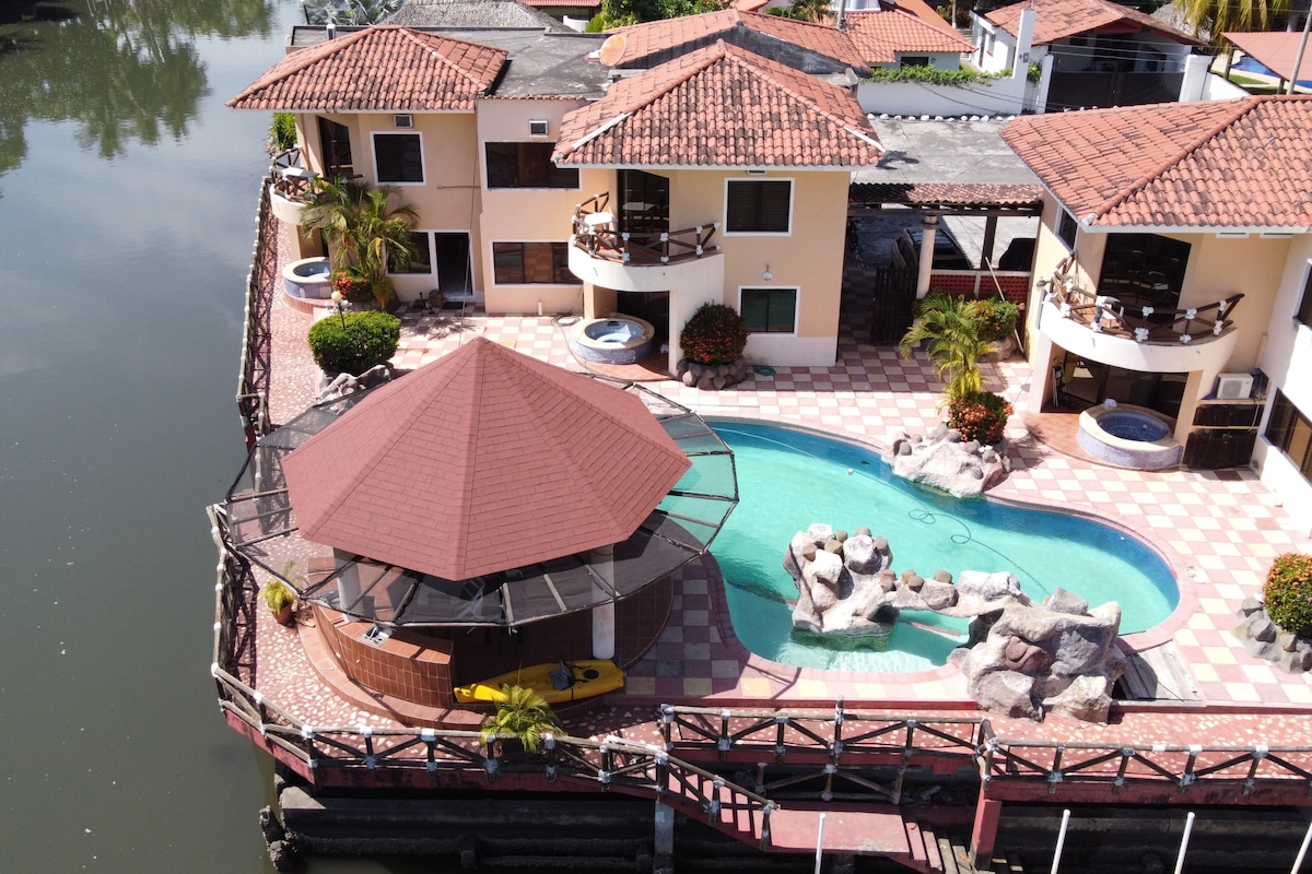 La casa se encuentra en el condominio San Marino 2, la casa se localiza frente al canal también cuenta con piscina y jacuzzi, como dos ranchos en uno se encuentra una area de bar y mesas y en el otro rancho se encuentra una área de juegos, con mesa de billar, una mesa de futbolito. condominio cuenta con acceso a playa privada y area de juegos. Inmejorables vistas al canal y manglares, disfrutando de la naturaleza Maritima que nos regala este hermoso lugar.