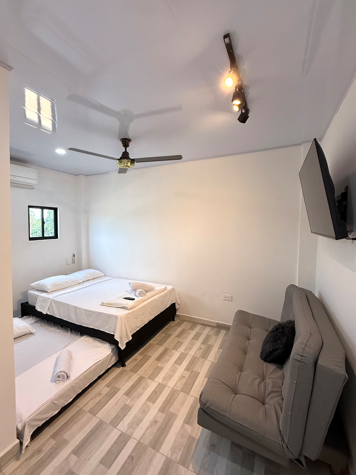 APTO PARA 7 Pax, 1 habitación grande para 5 pax y en la sala comedor una cama tarima para 2 pax, 1 km de la Hacienda Nápoles, 1 cuadra del parque principal, sector concurrido cerca a todo(iglesia, farmacias, supermercados, restaurantes, bares y discotecas) cerca al terminal y al Santorini Colombiano), 20 minutos de la Reserva natural Rio Claro. Cuenta con AC, nevera, cocina, microondas, baño, TV.