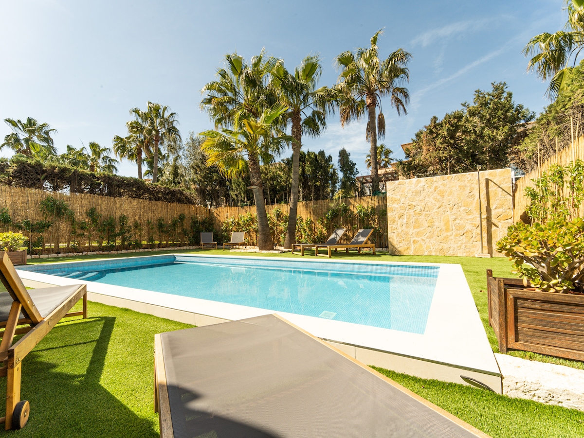 Encantadora e íntima casa a 10 min. de Palma con 7000m2 de Jardin, piscina, Jacuzzi exterior climatizado y precioso jardín. Consta de 3 dormitorios y 2 baños .Dispone de gran terraza con vistas al jardín, porches, chimeneas, barbacoa, aire acondicionado y calefacción…Muy amplio y cómodo. Zona tranquila a 7km del centro de Palma, aeropuerto y playas. Supermercados a 1km. Ideal para descansar, excursiones por la isla, ciclismo etc...Nos encantan las mascotas, así que tráetela ;-)
