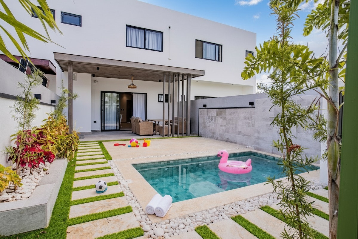 Escape to your private Punta Cana oasis! This newly built, stylish, and tastefully decorated 3BR condo is located in a secure gated community and is a 3-minute drive from downtown PC. Lounge by the private and cozy backyard pool, enjoy modern comforts (fast WiFi, fully stocked kitchen, AC), and immerse yourself in the vibrant local scene with easy access to dining, nightlife, beaches, and endless adventures. Book now and create unforgettable memories in this unique and family accommodation!