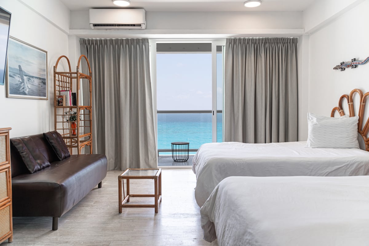 Recently remodeled, direct Beach View Studio apartment, located in the most alive area of Cancun's Hotel zone but still great for relaxing, km 9.5, right next to the hard rock cafe, 24/7 convenience stores near, 24/7 bus services right in front & walking distance from the party zone where all the best clubs/discos are located and of course the amazing turquoise Caribbean an elevator ride away.