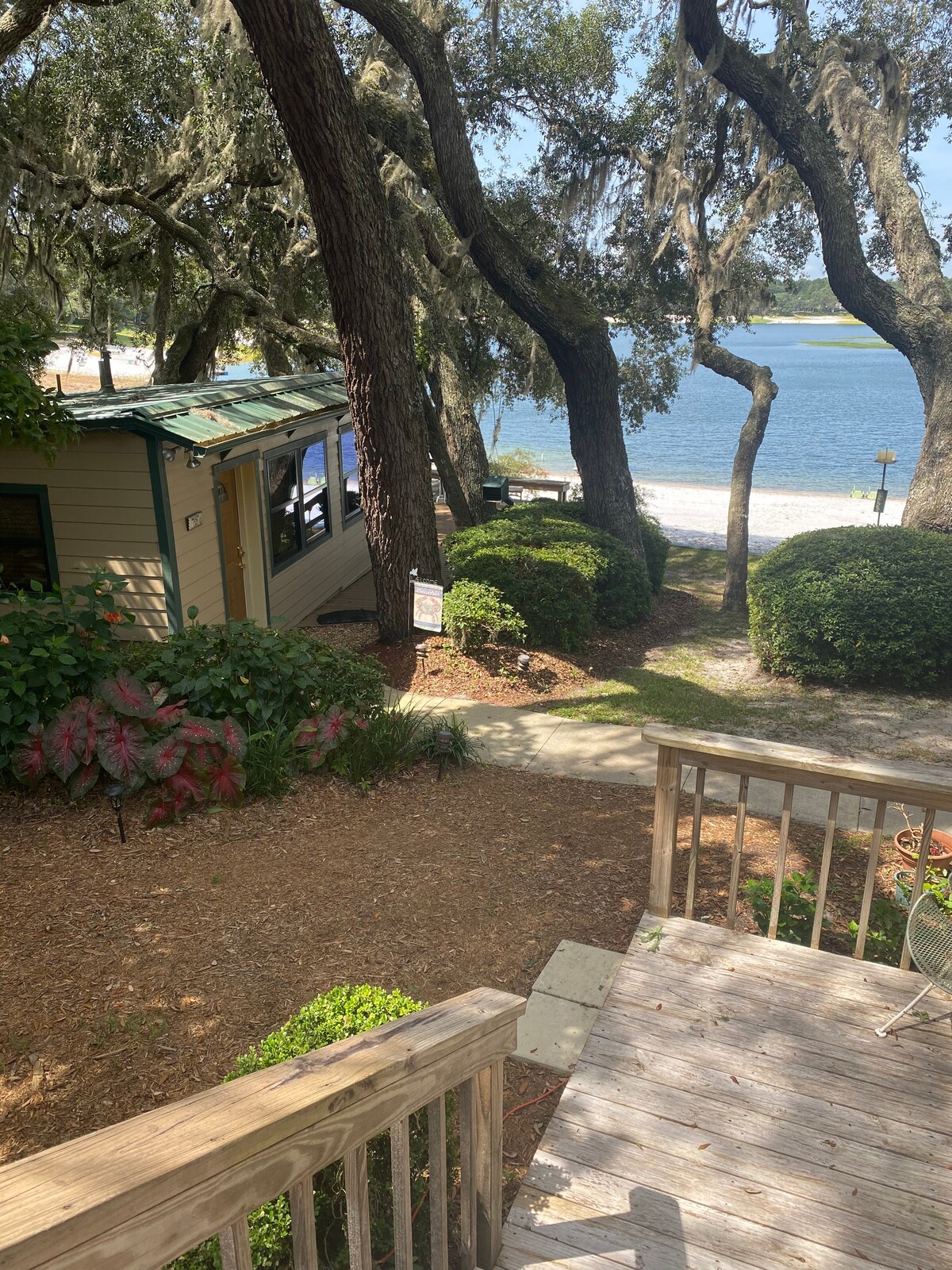 A perfect little getaway on the Bay of Lake Brooklyn in the quaint little town of Keystone Heights, which lies between Jacksonville and Gainesville, Florida. Beautiful modern cottage surrounded by large oak trees, multi-level wood deck with steps leading to beautiful white sand beach for swimming, sunning, fishing and watching the beautiful sunsets!