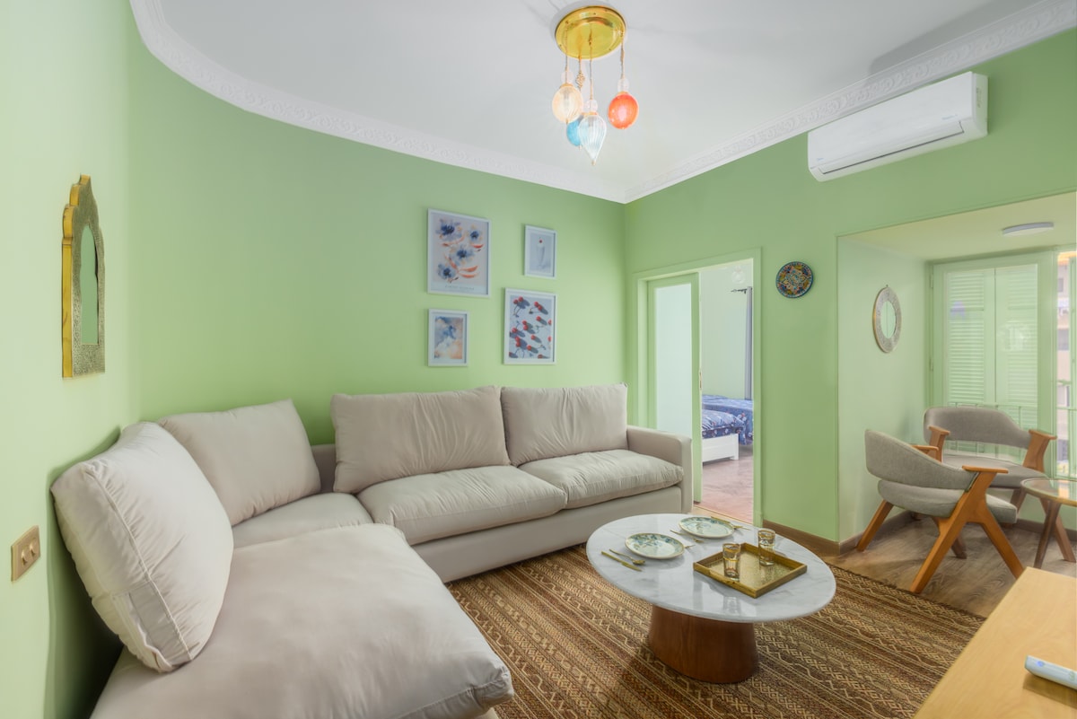 Un acogedor apartamento en el corazón del centro de El Cairo, cerca del Cairo histórico, el Museo Egipcio y la plaza Tahrir. El departamento ofrece dos cómodos dormitorios, una cocina totalmente equipada con un comedor y techos altos de 4 metros que crean un ambiente luminoso y espacioso. Tiene capacidad para cuatro huéspedes, con una cama grande en el dormitorio principal, otra cama grande en el segundo dormitorio y una acogedora sala de estar para relajarse.