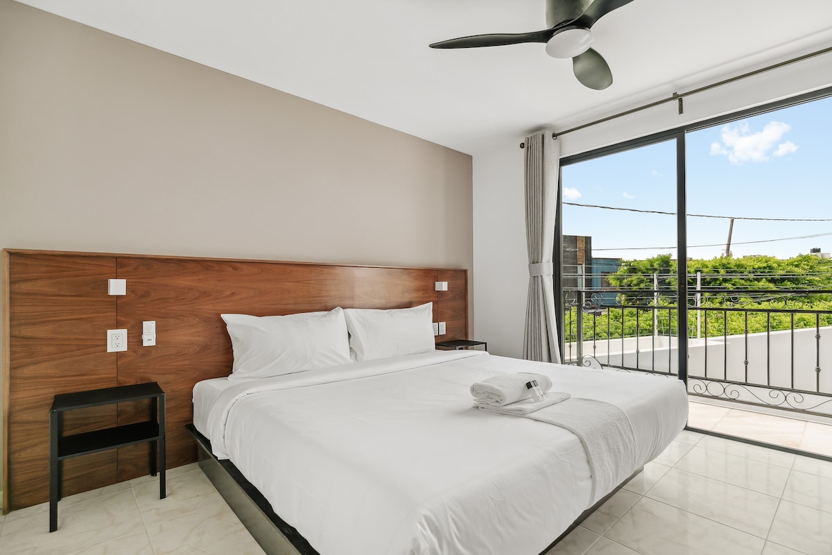 La suite esta equipada para brindar el mayor confort. Descanse en su cama King Size con colchón memory foam mientras ve una película en la smart TV, WIFI alta velocidad. Imagine poder despertarse y tomar un delicioso café en el maravilloso y amplio balcón mientras trabaja o lee con una vista privilegiada. Disfrute de un buen baño en una regadera amplia con acabados de alta calidad.