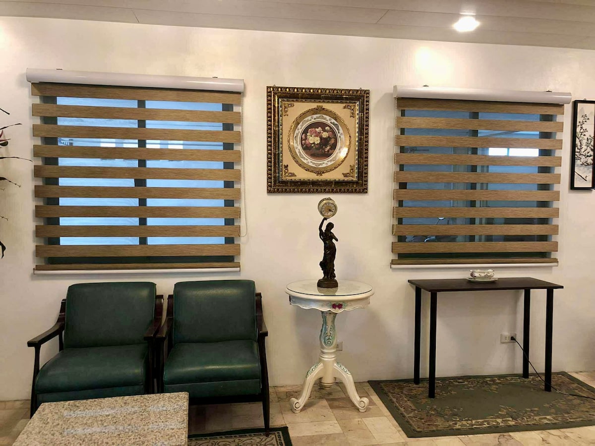 Nuestro alojamiento es un estudio de 40 metros cuadrados totalmente amueblado y decorado con cariño, situado justo en el corazón de QC, ideal para grupos grandes, ya que es el doble del tamaño habitual de las unidades del condominio. A poca distancia a pie del ayuntamiento, los principales hospitales (Heart Center, Lung Center, NKTI) y QC Circle. La famosa zona de restaurantes de Maginhawa está a solo 5 minutos en coche. Justo fuera del edificio hay restaurantes abiertos las 24 horas, tiendas y spas. UP Diliman, SM North y TriNoMa están a 15 minutos.