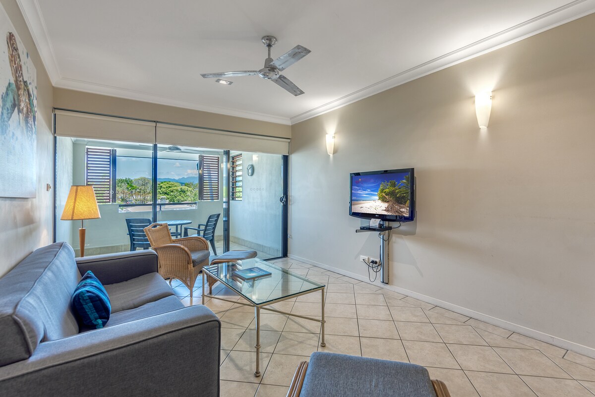 A room with a fantastic view, right in the heart of town! Refurbished with a colourful, ultra-tropical style, this large studio apartment is fun and vibrant. From your balcony, take in views of the Inlet, the mountains, the park, all right in town! Enjoy free, super-strong WIFI and Netflix connection, this apartment truly has it all!