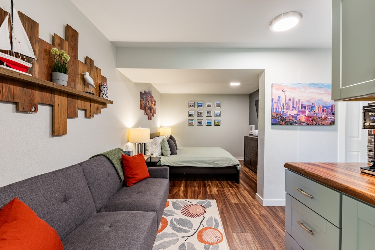 Casa de huéspedes aislada, luminosa y moderna con vistas completas al jardín, a 5 minutos de la autopista y a 10 minutos del ferry en el oeste de Bremerton. El espacio es una unidad independiente separada de nuestra casa principal escondida de la calle principal, enclavada entre los cedros y abetos a lo largo de Mud Bay que conecta con Puget Sound. La habitación tiene una vista completa de 270 grados de los jardines y árboles, cama tamaño queen murphy, nevera, fregadero, microondas, estufa de leña y baño, completo con ducha de lluvia al aire libre de 16 pulgadas.