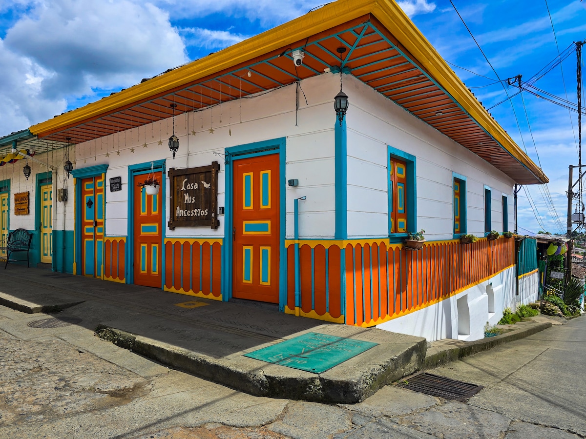 Casa Típica Mis Ancestros es un lugar muy central y muy tranquilo para descansar. Estamos ubicados a 1 cuadra de la Calle Principal de Salento donde se encuentran todas las artesanías, los restaurantes, supermercados, cafés, etc. Todo está completamente cerca para mayor comodidad. Nuestra casa es una casa típica de nuestra region con colores que representan nuestra cultura cafetera.